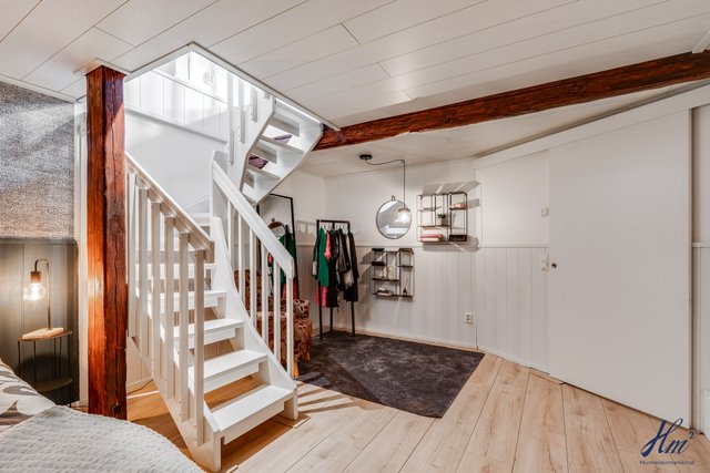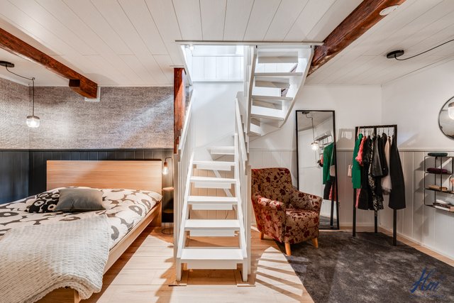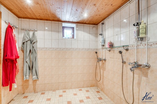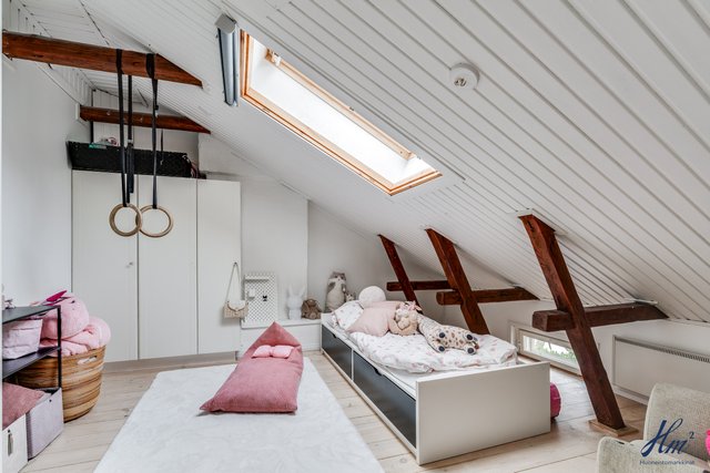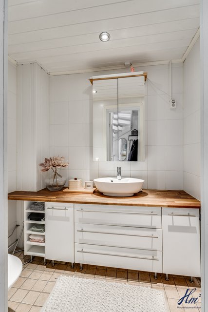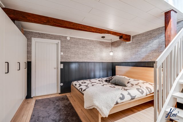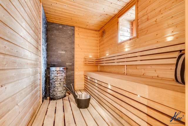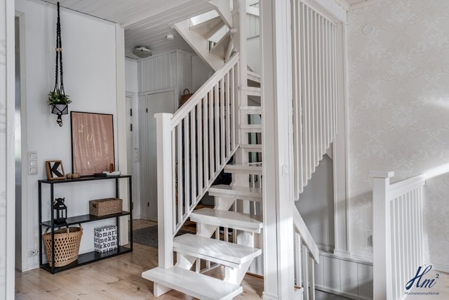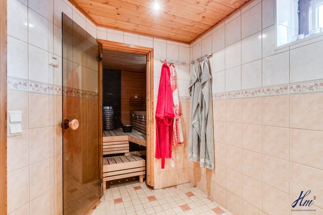 Kodikasta tunnelmaa täydentää perinteinen puulattia. Kylpyhuoneessa on mukavuutta lisäävä lattialämmitys ja kaksi suihkua. Oma sauna tarjoaa rentouttavia hetkiä kiireisen päivän päätteeksi.