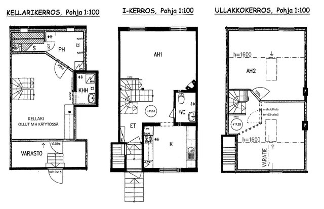 Kellari krs: huone+khh+ph+s+var. Asuinkerros: et+k+oh+wc. Yläkerta 2x mh