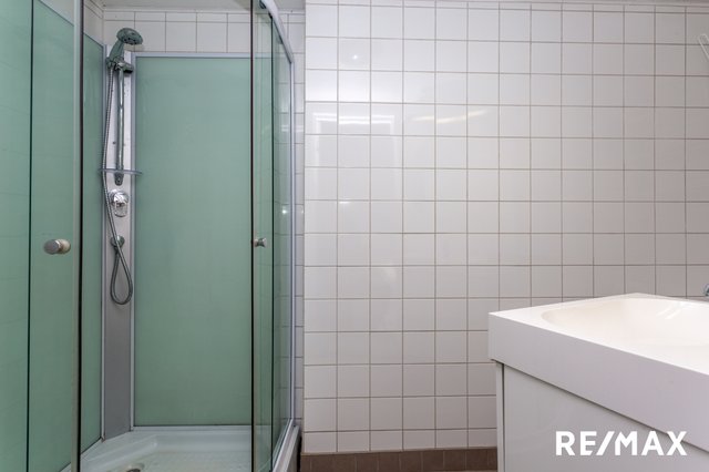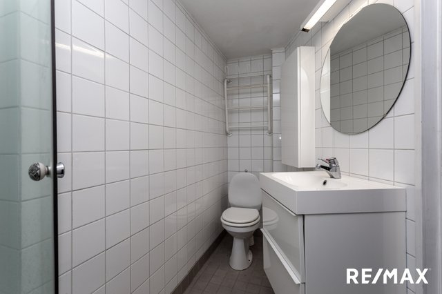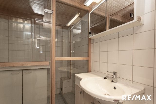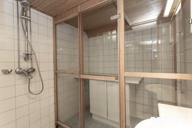 - Suihkukaappi, wc-istuin, pesuallas, peili, allaskaappi, suihku, ja lattialämmitys