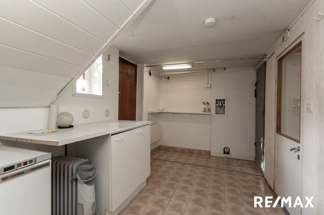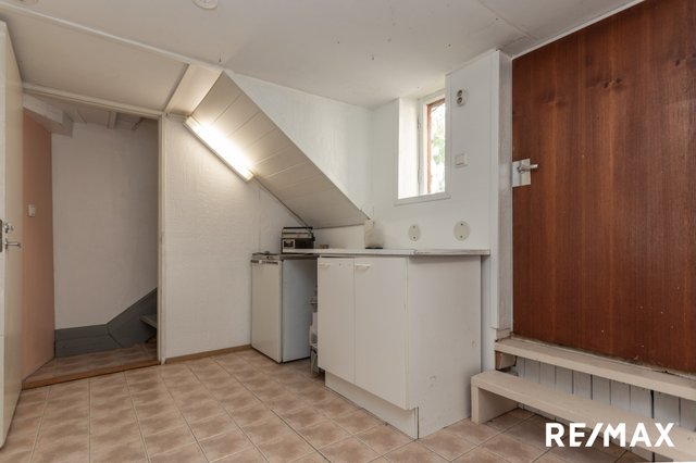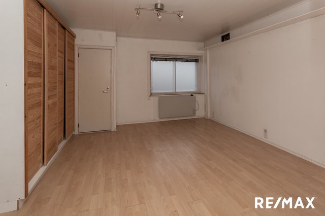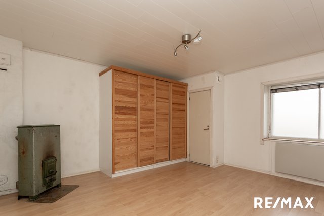 Kellarikerroksessa on huone omalla sisäänkäynnillä ja Porin Matti lämmittämässä siellä. Kellarikerroksesta saa remontoimalla mieleisensä.