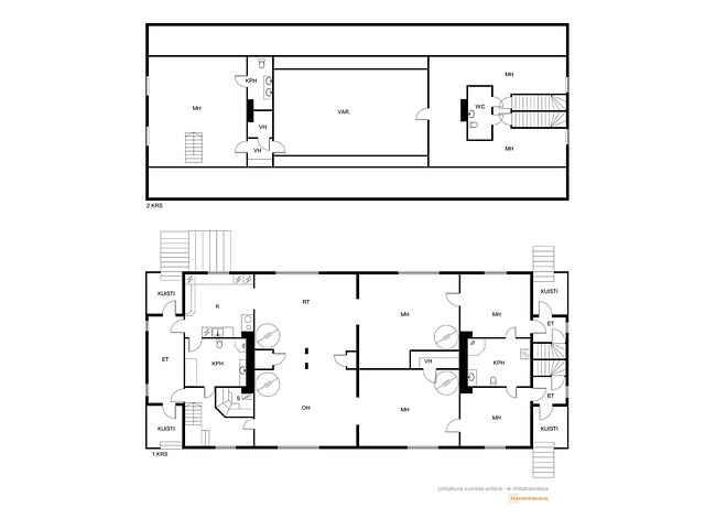 Ak: Oh/rt, k, kirjasto, 3 mh, kph/wc, s,et. Yk: mh/th, wc, ullakko, pieni kaksio, kph. Kellari