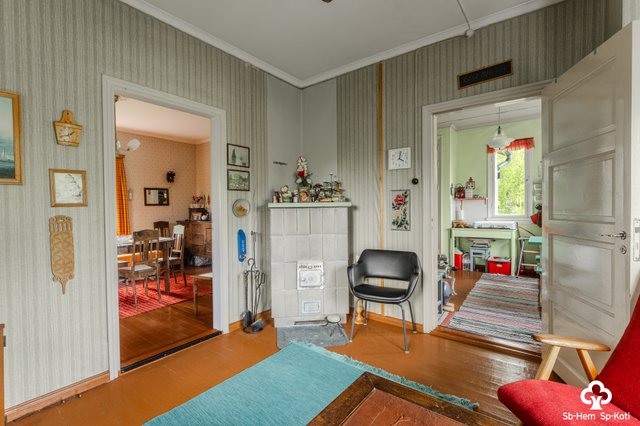 Huset omfattar farstu, tambur, kök,sovrum, vardagsrum i nedre våningen samt ett sovrum på vinden och kall vind.