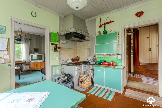 Talossa on useampi tulisija sähkölämmityksen lisäksi. Kylmä vesi tulee sisään talon keittiöön.