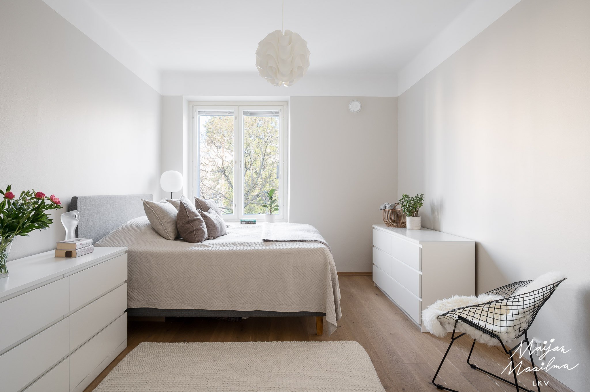 - Makuuhuone 1/päämakuuhuone: Parkettilattiat, maalatut seinät. Walk-in-vaatehuone makuuhuoneen yhteydessä. Walk-in-vaatehuone: Parkettilattiat, maalatut seinät. Hyllytilaa ja tilaa ripustettaville vaatteille. Makuuhuone 2: Parkettilattiat, maalatut seinät.