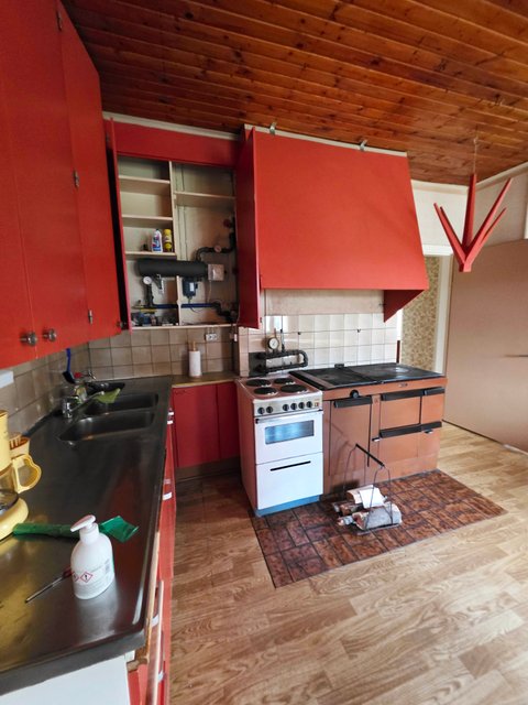 - Vanha iso tupakeittiö tyylinen huone, jossa isot ikkunat kahteen ilmansuuntaan + puuhella.