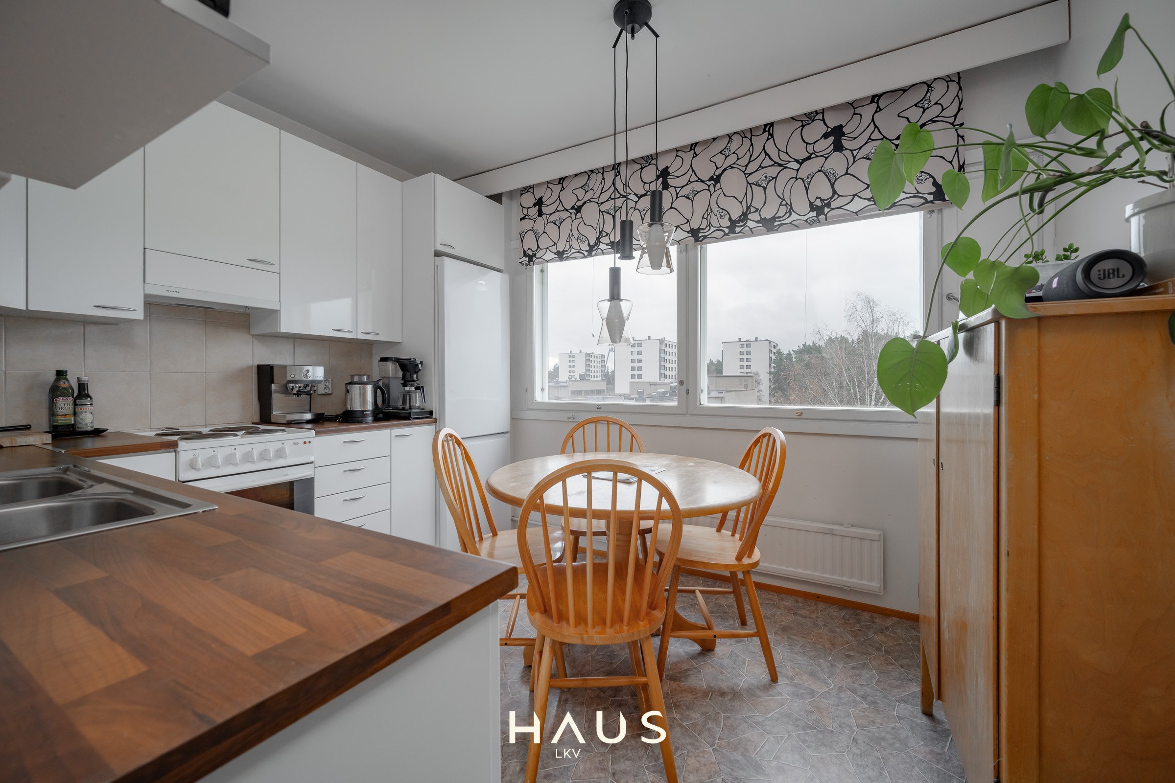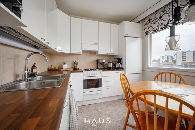 - Hyväkuntoinen keittiö jossa tilaa ruokapöydälle.