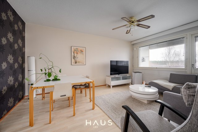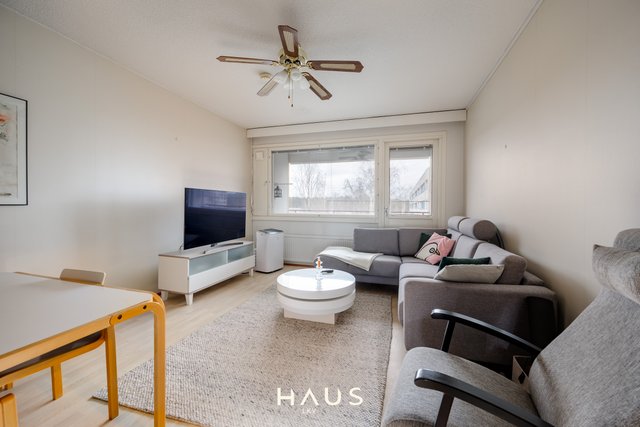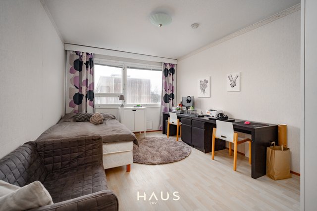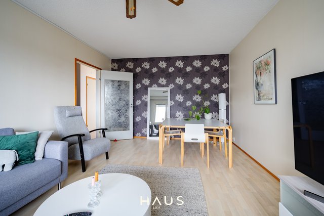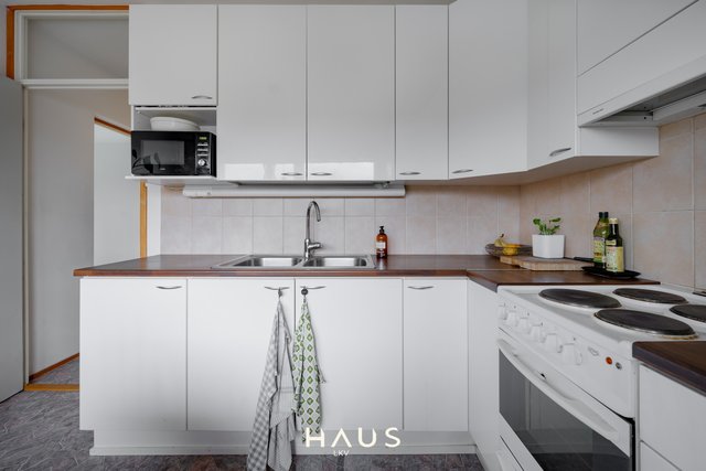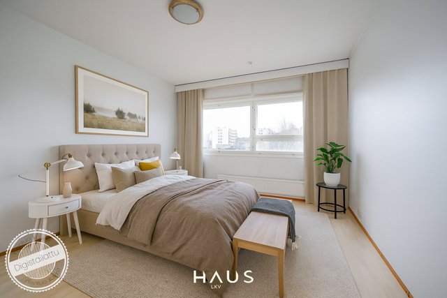 Asunnon molemmat makuuhuoneet ovat harvinaisen tilavia, ja säilytystilaa löytyy reilusti niin kaapistoista kuin suuresta eteisestä. Keittiö on siistissä kunnossa ja hyvin varusteltu, ja astianpesukoneelle on valmiiksi paikka. Linjasaneerauksen yhteydessä uusittu kylpyhuone on moderni ja toimiva. Olohuoneesta avautuu kulku etelään suuntautuvalle lasitetulle parvekkeelle.