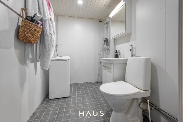 - WC-istuin, suihku, pesukoneliitäntä, peilikaappi, pesuallas, allaskaappi, ja bidee-suihku