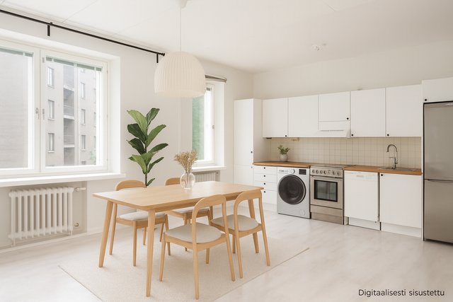 Tämän valoisan kodin sijainti on erinomainen lähellä hyviä palveluita, liikenneyhteyksiä ja kaupungin elämää. Asunnon muokattu pohjaratkaisu on toimiva. Keittiön ja olohuoneen väliltä on poistettu seinä ja muodostunut tila on avara ja valoisa. Keittiössä on reilusti tilaa kaapeissa ja varustelu on kattava. Kylpyhuoneessa on kaikki tarvittava, mukaan lukien pesukoneliitäntä.