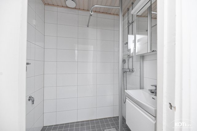 - WC-istuin, suihku, pesukoneliitäntä, pesuallas, peilikaappi, ja allaskaappi