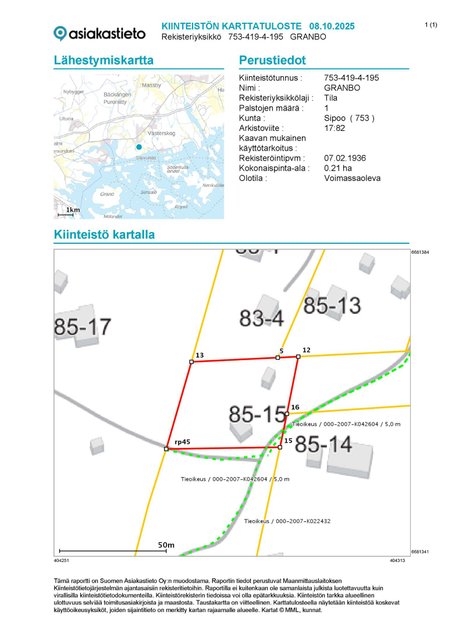 - Alueella on voimassa Sipoon yleiskaava (753-2025) MMLm/4759/423/2012. Kiinteistö sijoittuu yleiskaavassa kyläalueelle (AT). Lisäksi alueella on vireillä Gumbostrand-Västerskogin osayleiskaava. https://www.sipoo.fi/kaavoitus-ja-kehittaminen/yleiskaavoitus-yleiskaavakartta-yleiskaavakartat-kaava-kartalla/vireilla-olevat-yleiskaavat/g-27-gumbostrand-vasterskog-hitan-osayleiskaava/