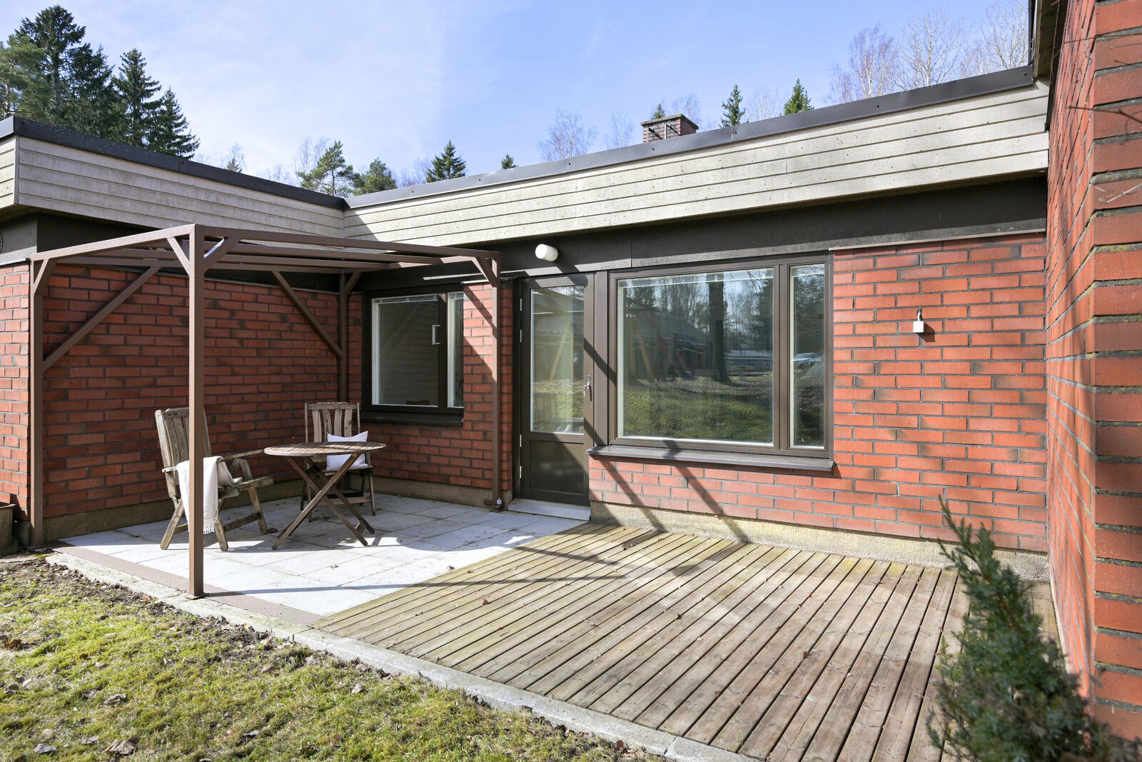 Olohuone ja keittiö avautuu asukkaan käytössä olevalle puutarhamaiselle piha-alueelle. Pihan terassi on osaksi lautaa ja osaksi graniittilaattaa. Laatan päälle on rakennettu metallinen kehikko, jota voi hyödyntää terassin sisustuksessa. Kodin sekä etu- että takapihan nurmialueet voi halutessaan koristaa istutuksilla.