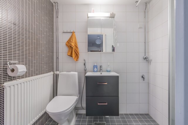 - WC-istuin, suihku, pesukoneliitäntä, lattialämmitys, peilikaappi, allaskaappi, bidee-suihku, ja suihkuseinä