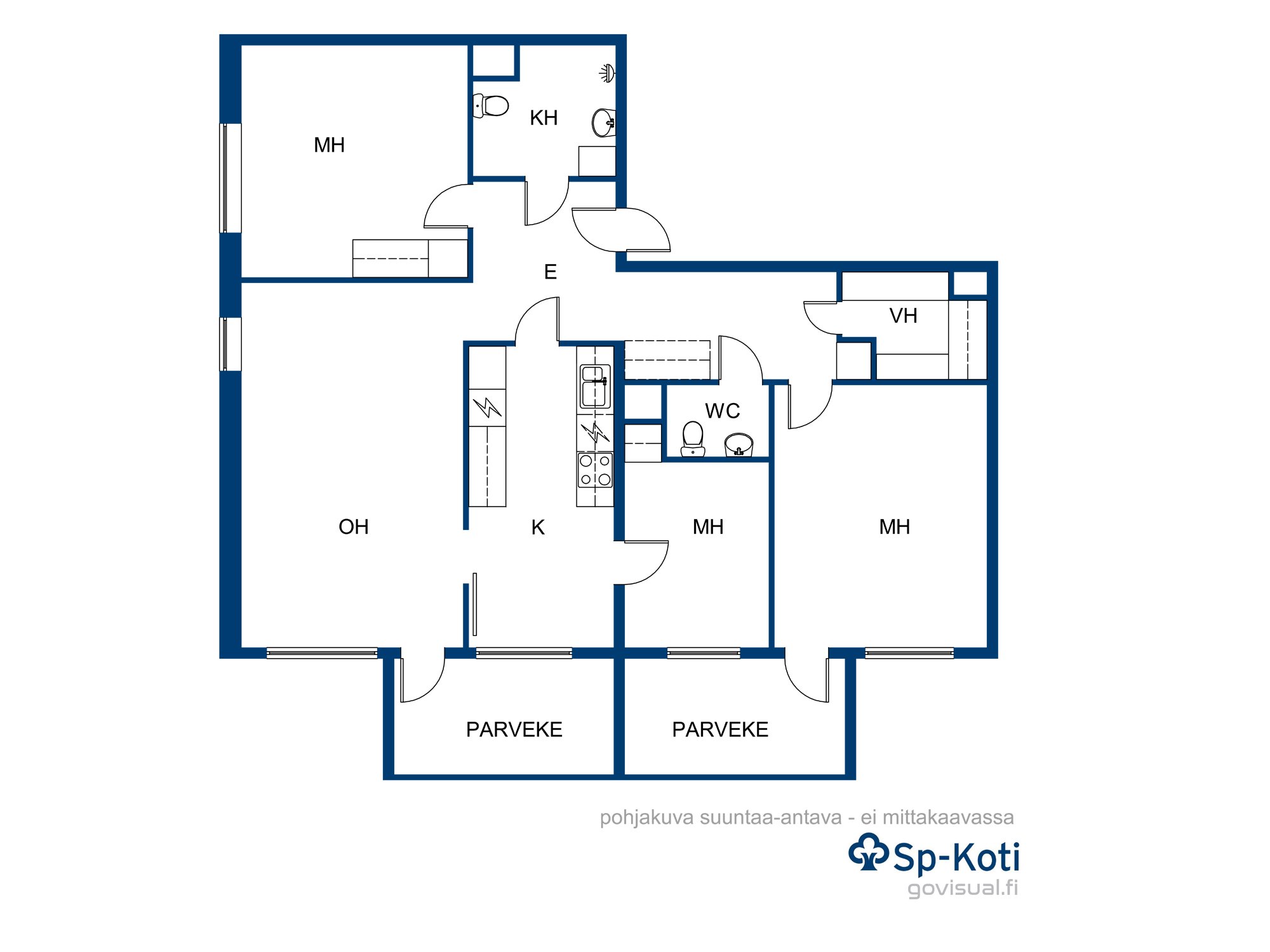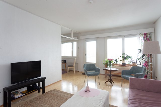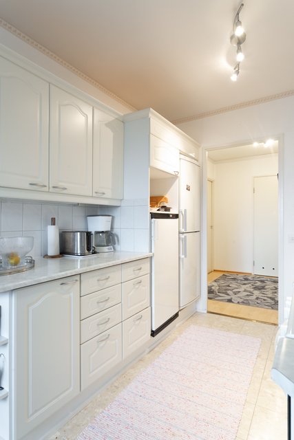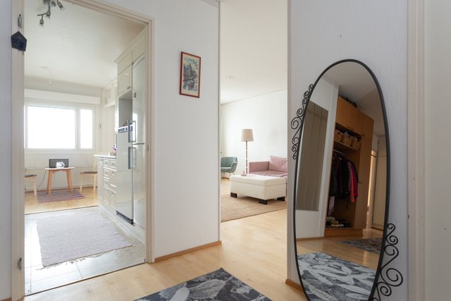 Asunnossa on kolme makuuhuonetta, jotka tarjoavat runsaasti tilaa perheen jokaiselle jäsenelle. Olohuoneessa on kaunis parkettilattia, joka tuo lämpöä ja kodikkuutta tilaan. Keittiössä on modernit laitteet, kuten keraaminen liesi ja jääkaappi-pakastin ja sen laattalattia on sekä käytännöllinen että tyylikäs. Kylpyhuone on varustettu pesukoneliitännällä ja erillinen wc lisää arjen mukavuutta.