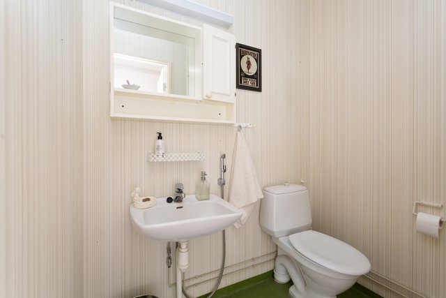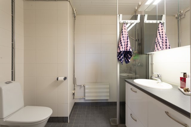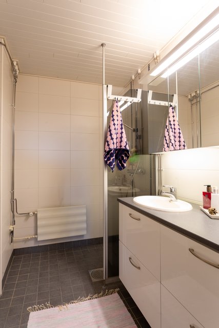 - WC-istuin, suihkuseinä, peilikaappi, ja pesukoneliitäntä