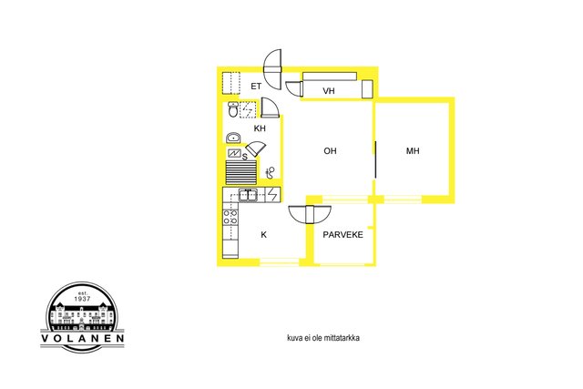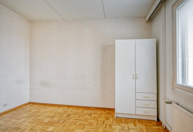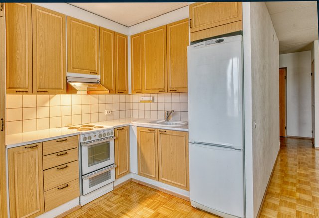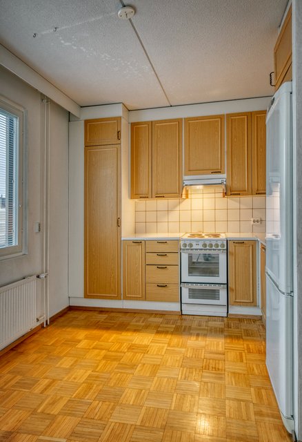 - Alkuperäiset kaapistot, liesi, jää-pakastinkaappi. Seinät maalattu ja lattia parkettia.
