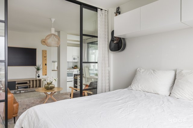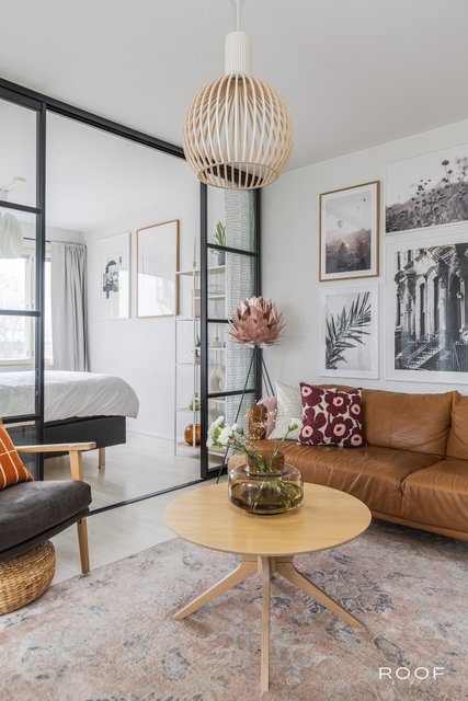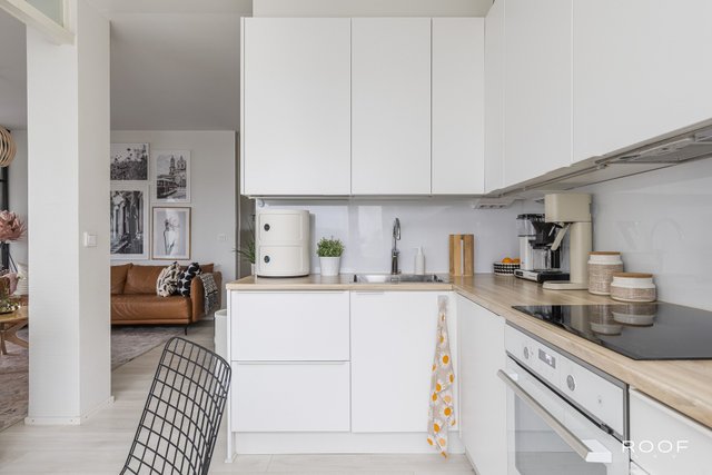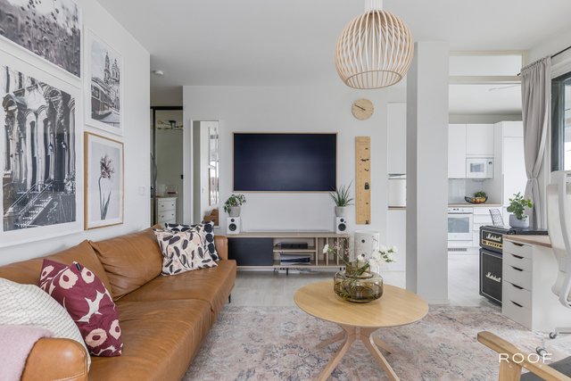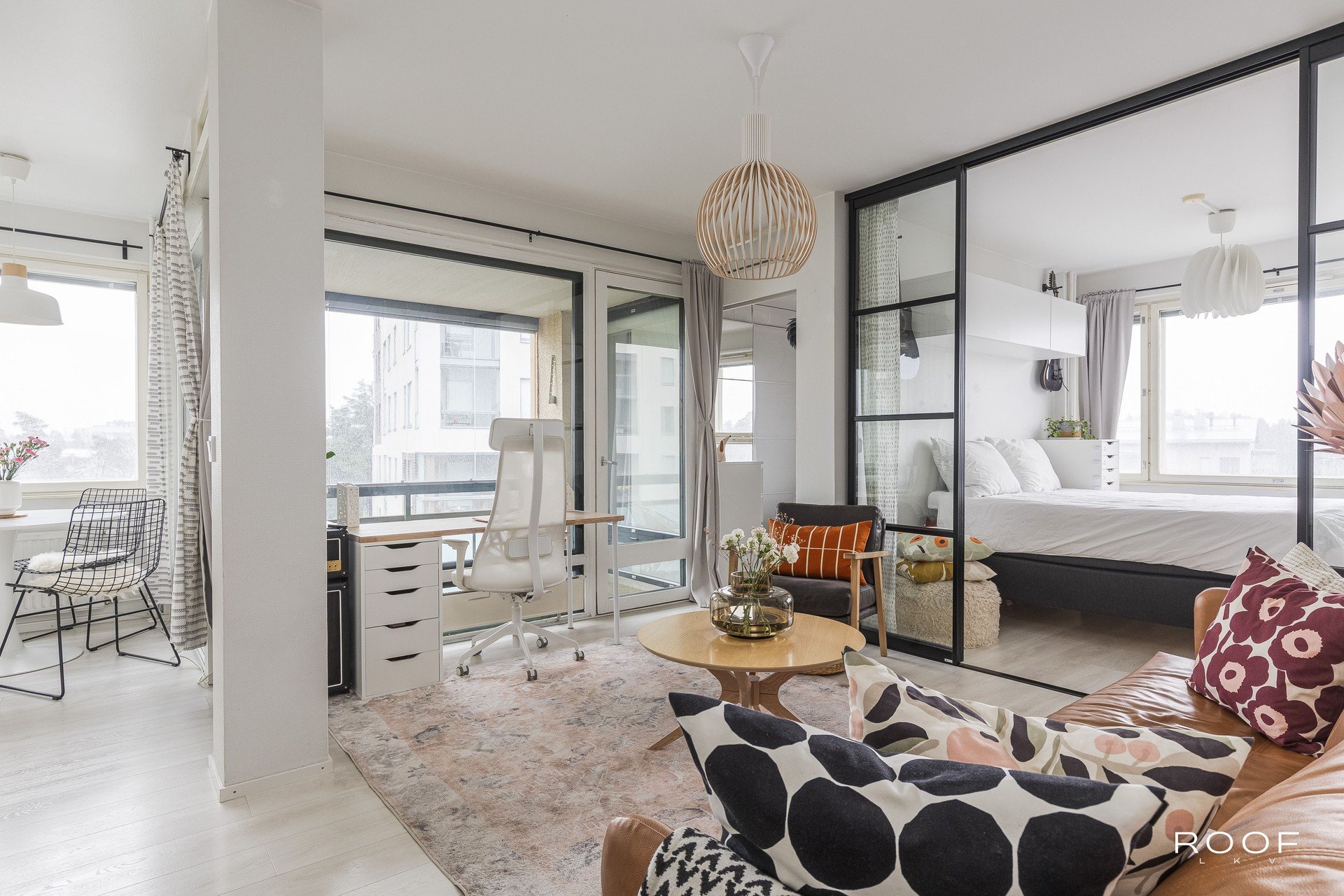 Asunnon sydän on valoisa olohuone, josta on käynti lasitetulle parvekkeelle. Keittiö on erillisinä huoneena mutta silti avoimena suoraan olohuoneeseen. Säilytystilaa on runsaasti eteisen ja makuuhuoneen liukuovikaapistoissa sekä vaatehuoneessa. Olohuoneen ja makuuhuoneen tilanjakajana toimii tyylikäs lasiseinä.
