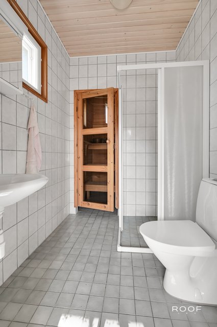 - WC-istuin, suihku, suihkuseinä, pesukoneliitäntä, lattialämmitys, peilikaappi, peili, pesuallas, ja allaskaappi