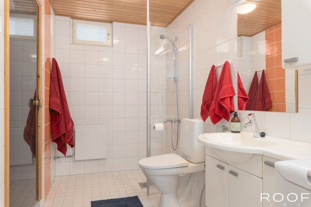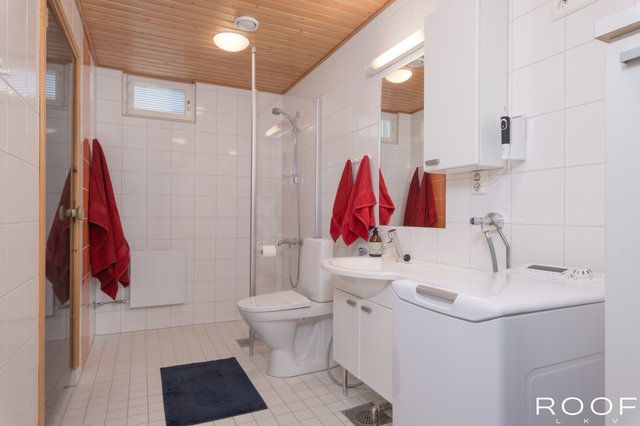 - WC-istuin, suihku, suihkuseinä, pesukoneliitäntä, peili, allaskaappi, pesuallas, bidee-suihku, lattialämmitys (sähkökaapeli), ja seinäkaappi, pyykkikaappi, ilmanvaihtokone