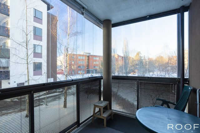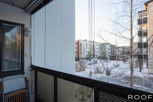 - Ulos käynti tilavalle parvekkeelle. Ilmalämpöpumppu viilennykseen, asennettu 2022.