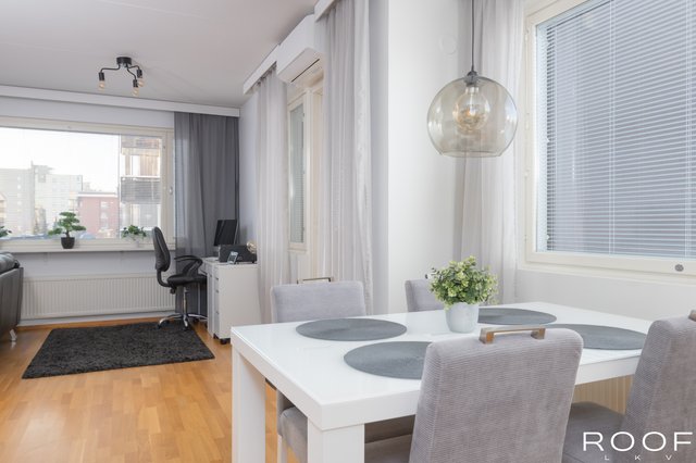 Tämä tilava ja valoisa kaksio sijaitsee aivan keskustan tuntumassa. Tähän päätyhuoneistoon tulvii valoa kolmesta ilmansuunnasta. Asunnon lasitetulta parvekkeelta sekä keittiöstä avautuvat upeat näkymät lammelle, mikä tuo rauhaa ja luonnonläheisyyttä kaupunkiasumiseen.