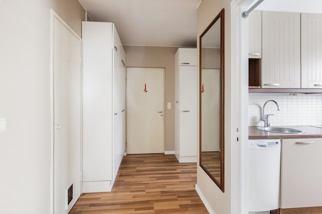 Säilytystilaa ja mukavuutta: Kodissa on käytännöllinen vaatehuone ja oma parveke, joka tuo lisätilaa oleskeluun.