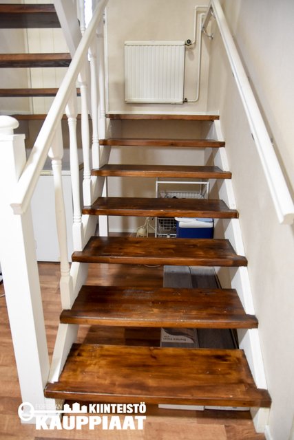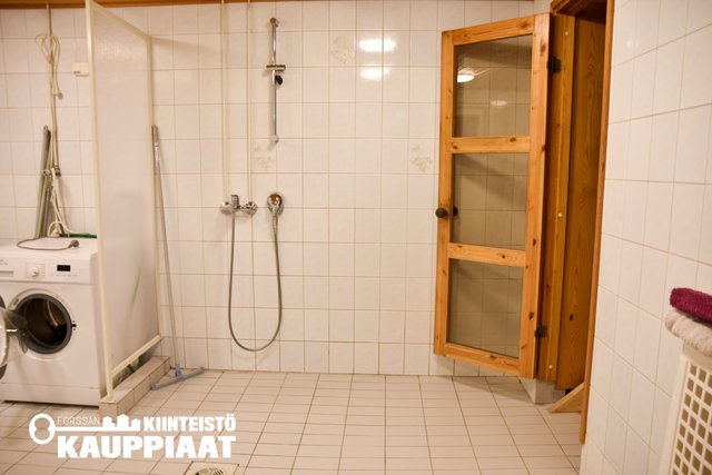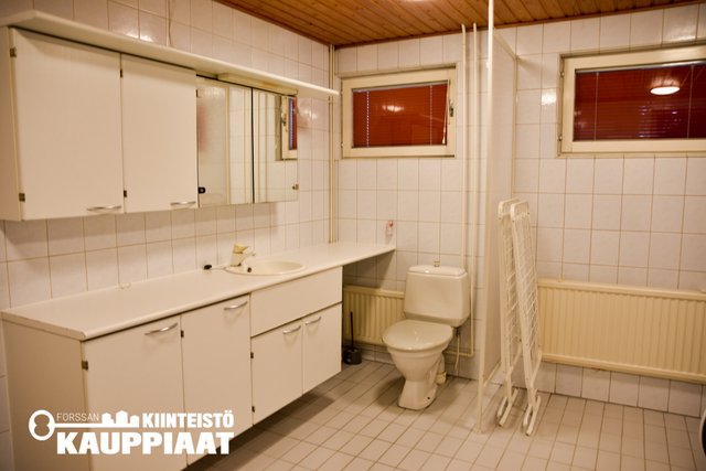 - Alakerrassa iso, laatoitettu pesuhuone, jossa vessa, käsienpesulavuaari ja kaapistot sekä paikka pyykkikoneelle.