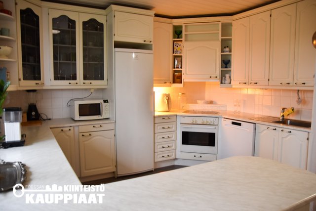 - Vaalean sävyinen kaapisto ja kätevä niemeke antaa lisää työskentelytilaa. Kodinkoneina keraaminen liesi, erillisuuni, astianpesukone ja jääkaappi. Kulku parvekkeelle.