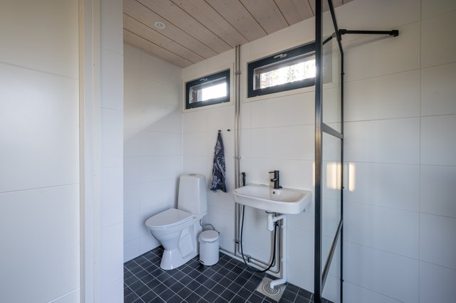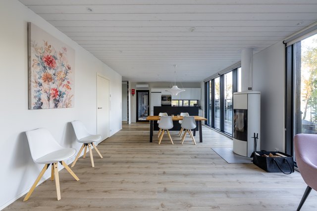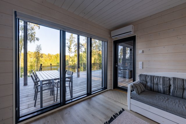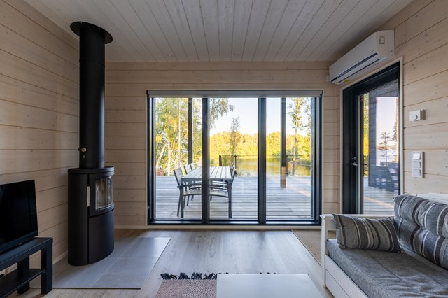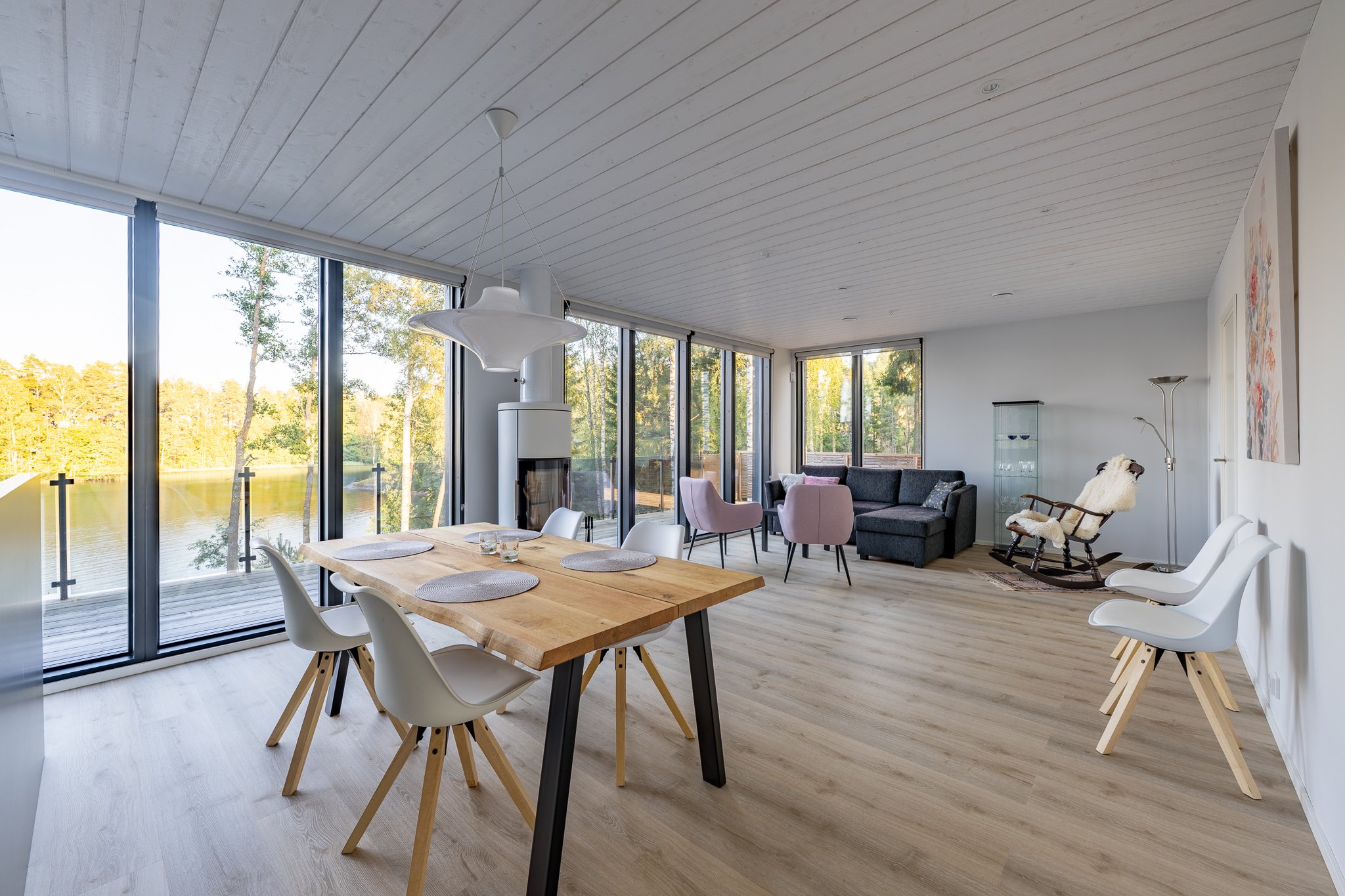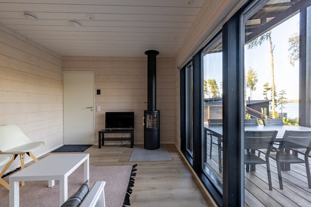 Lomavillan sisustuksessa on panostettu laatuun ja viihtyvyyteen; lattioilla on kulutusta kestävä vinyyli ja seinät on maalattu raikkailla väreillä. Keittiö on varustettu nykyaikaisilla kodinkoneilla ja induktioliedellä, mikä tekee ruoanlaitosta nautinnon. Olohuoneesta avautuu upeat näkymät ympäröivään luontoon, ja suuret ikkunat tuovat tilaan runsaasti valoa.