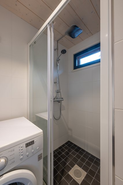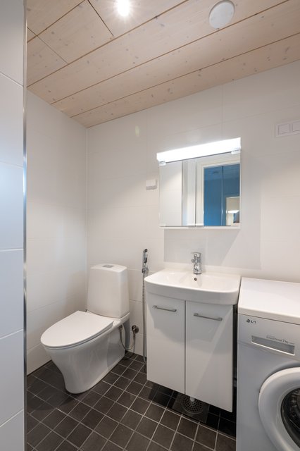 - Suihku, suihkuseinä, peilikaappi, allaskaappi, pesukoneliitäntä, ja lattialämmitys