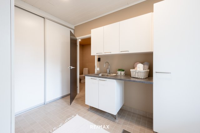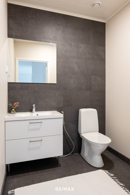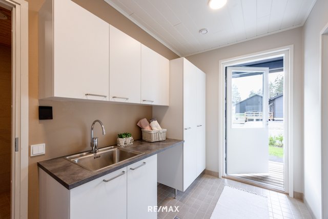 - Pesukoneliitäntä, lattialämmitys, pyykkikaapit, pesuallas, pöytätaso, ja lattiakaivo