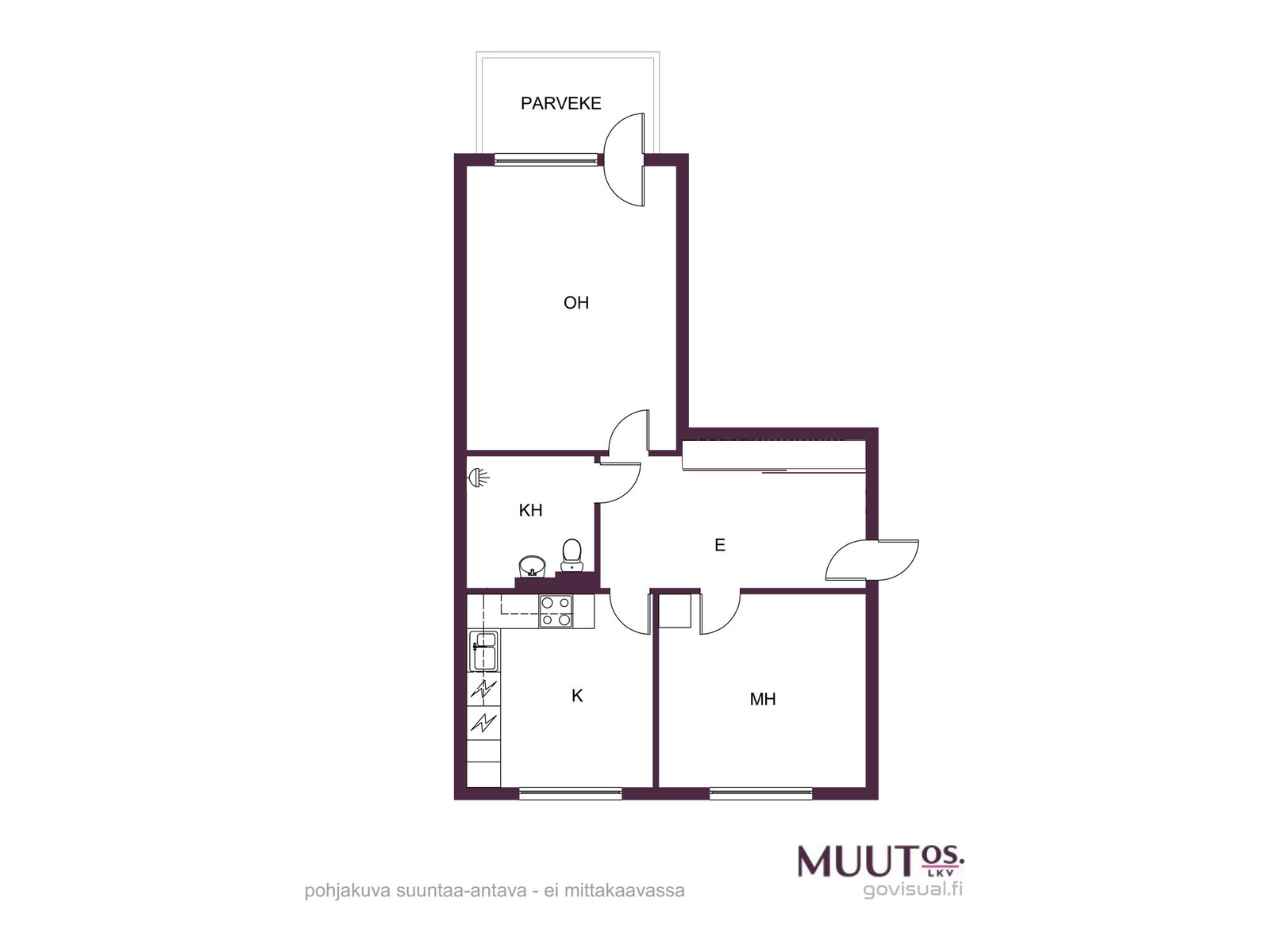 Asunto on pohjaratkaisultaan fiksu ja selkeä. Tässä läpitalon asunnossa keittiö ja makuuhuone asettuu fiksusti pohjoisen puolelle ja tilava olohuone sekä lasitettu parveke puolestaan valoisalle etelän puolelle. Huoneet ovat luvalla sanoen reilun kokoisia. Eteisen vaatehuone on purettu ja tilalle on tehty koko seinän leveydeltä lattiasta kattoon ulottuvat liukuovikaapistot, joiden ansiosta säilytystilaa on mukava määrä ja vielä käytännöllisessä muodossa. Kokonaisuus on siisti ja toimiva – helppo muokata omien tarpeiden mukaan.
