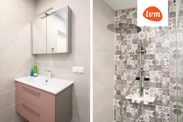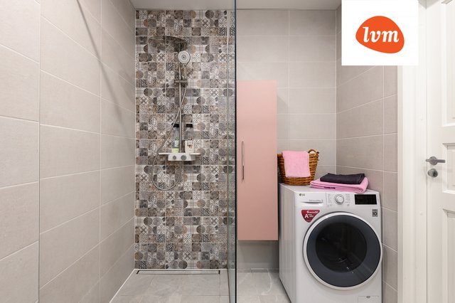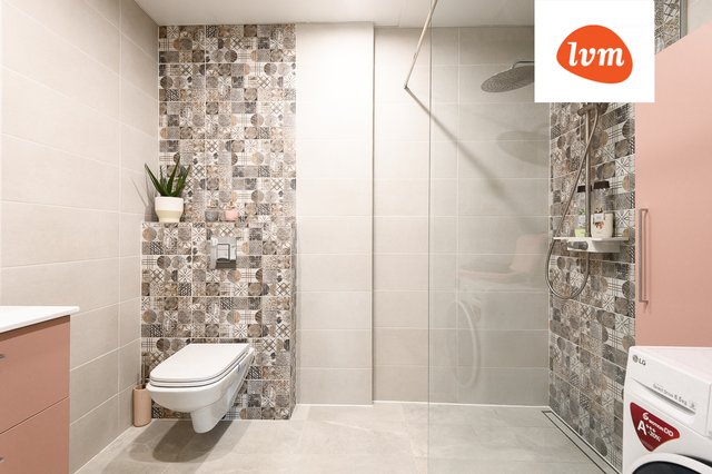 - Suihku, wc-istuin, suihkuseinä, pesukone, pesuallas, ja peili