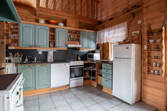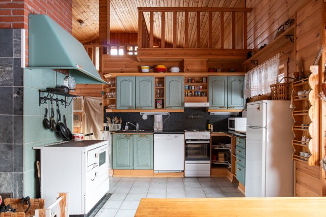 - Jenkkikaappi, liesi, liesituuletin, astianpesukone, ja puuhella