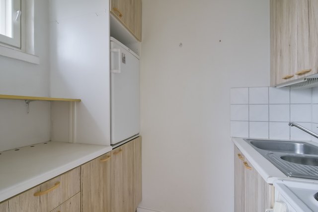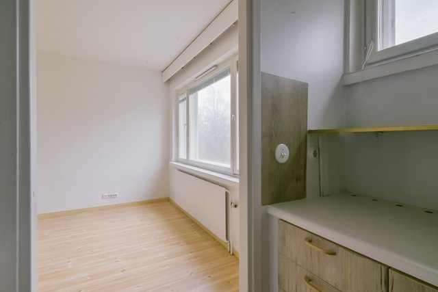 Kompaktin asunnon ikkunallisessa keittokomerossa on kaikki tarvittava päivittäiseen elämään.