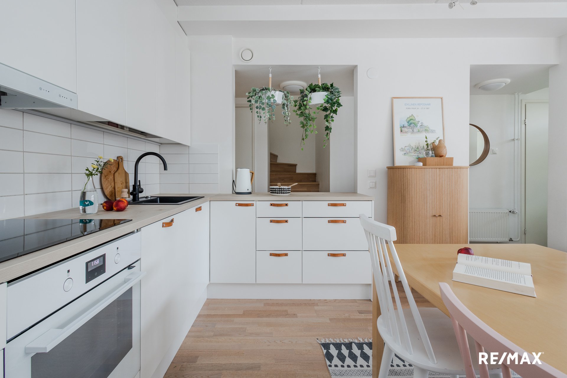Kodin vaalea, skandinaavinen tunnelma on yhdistelmä modernia kaupunkiasumista ja huoletonta arkea. Asunnon tilaratkaisut ovat tehokkaat ja käytännölliset. Alakerrassa on 2021 uudistettu avokeittiö, joka yhdistyy saumattomasti olohuoneeseen. Olohuoneesta on toinen kulku omalle terassille. Alakerran kylpyhuoneen yhteydessä on myös oma sauna. Portaiden alla on vielä käytännöllinen säilytystila. Yläkerroksessa on kaksi makuuhuonetta, ja niissä molemmissa on hyvin kaappitilaa säilytykseen. Kodin toinen kylpyhuone sijaitsee yläkerrassa. Toisessa makuuhuoneessa on ilmalämpöpumppu, joka tuo viilennystä kuumiin kesäpäiviin.