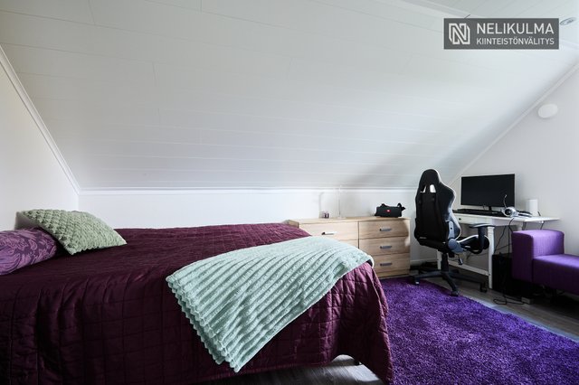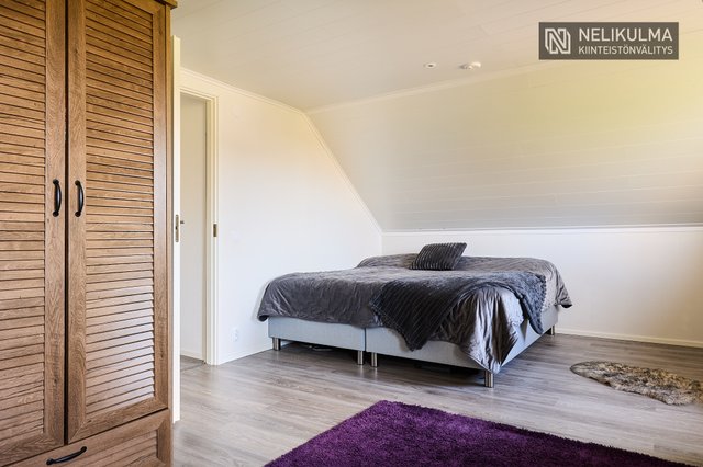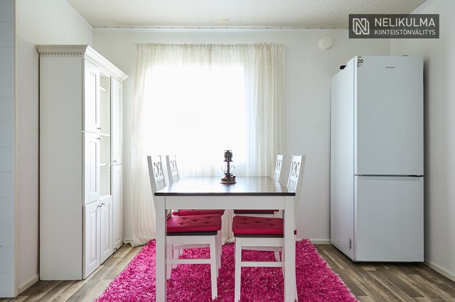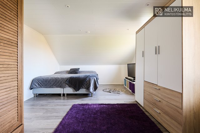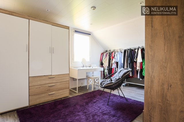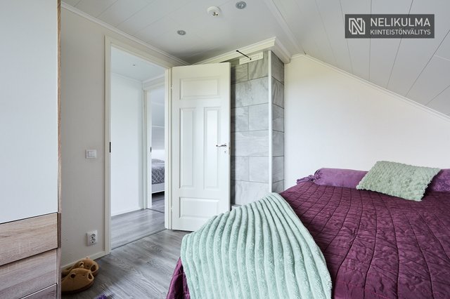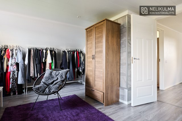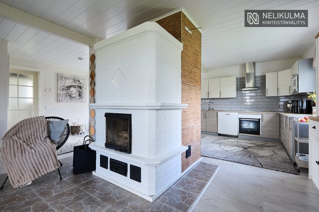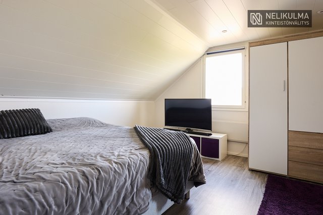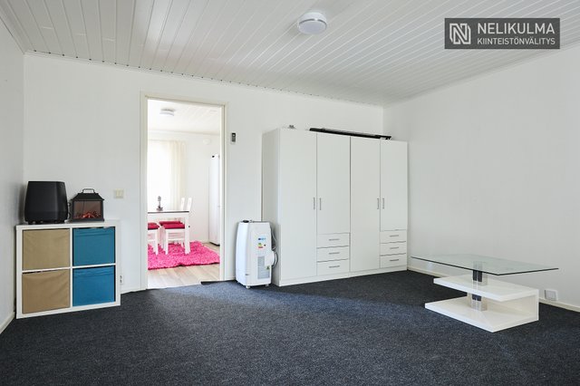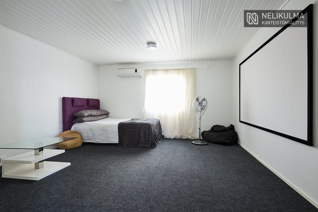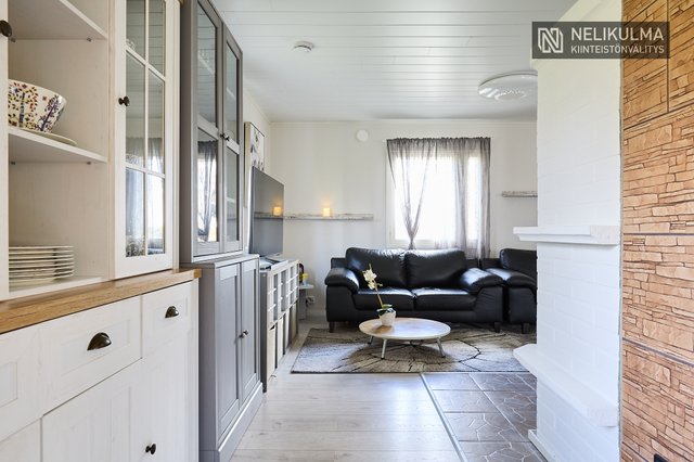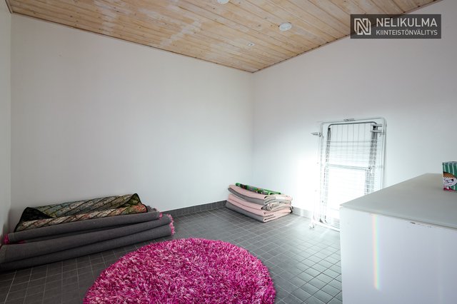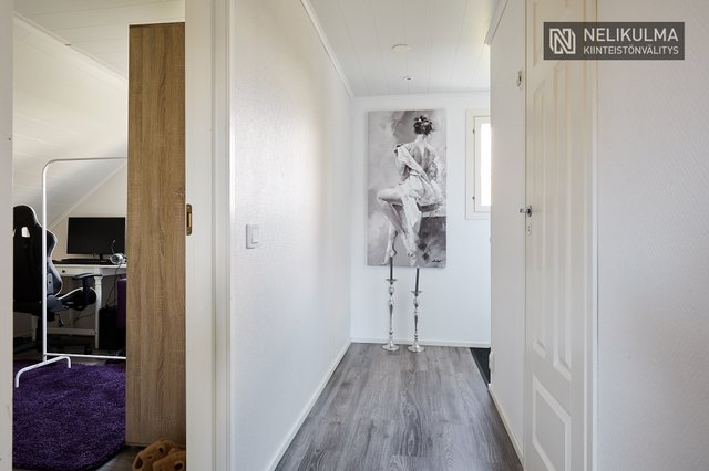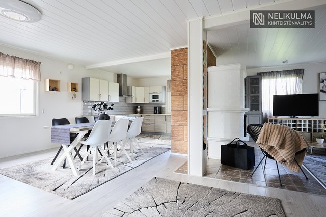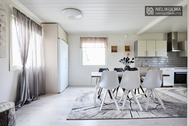 Iso tupakeittiö-olohuone takalla toimii kodin sydämenä. Yläkerrassa iso makuuhuone joka mahdollista jakaa kahdeksi, kylpyhuone ja hieman pienempi makuuhuone.