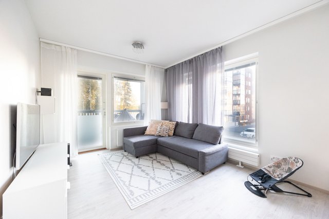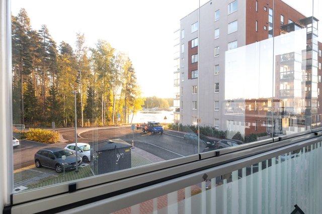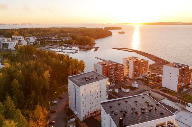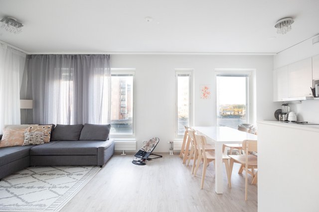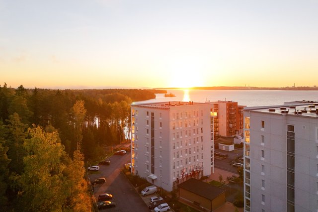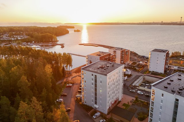Myyntiin avatun valoisan kulmahuoneiston peräti koko huoneiston levyiseltä lasitetulta parvekkeelle avautuu viehättävä näkymä kohti satama-aluetta. Avokeittiö jatkaa kodin yhtenäistä visuaalista linjaa sulautuen kauniisti osaksi oleskelutilaa, ja sen erillinen saareke toimii niin seurustelupisteenä, buffee- pöytänä kuin työpisteenäkin. Tällä huoneistolla on ikioma sauna jonka lämmöstä on suloista nauttia työpäivän tai juoksulenkin päätteeksi.