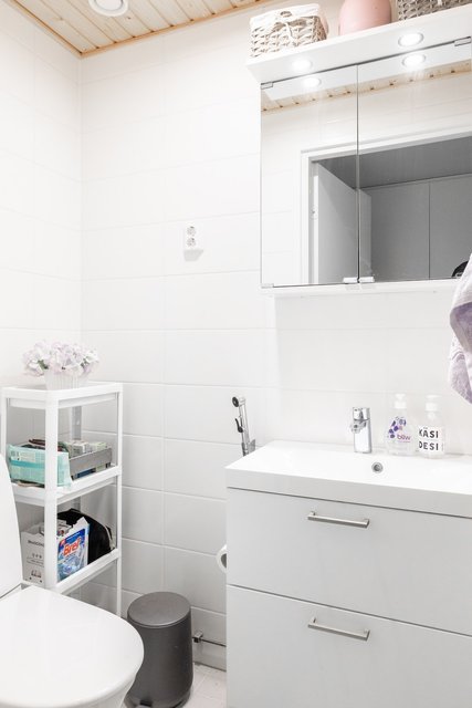 - Lattia: laatta. Seinät: laatta. Varusteet: peilikaapisto, allaskaapisto.