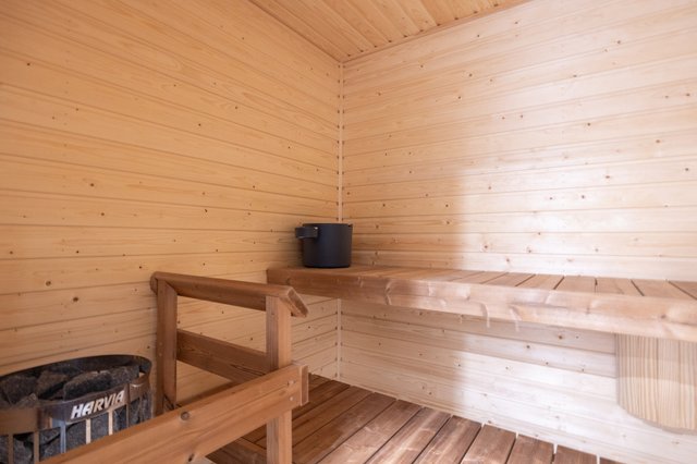 - Sähkökiuas. Kokolasinen saunanovi. Seinät: kuusipaneeli. Laudetasot ja -osat: kuusiLattia: laatta.