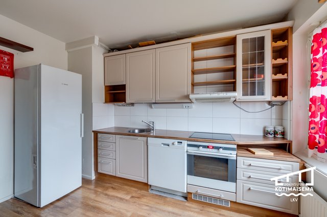 Hissitalon neljännen kerroksen kulmahuoneisto Niinivaaralla. Remontoitu keittiö on pyhitetty kokkailuun, valtavat kaappitilat ja pitkät työtasot palvelevat useampaakin kokkia. Suuren olohuoneen ehjät seinäpinnat antavat vapautta sisustamiseen, tilaa on niin ruokapöydälle kuin isommalle sohvaryhmälle. Molemmissa makuuhuoneissa ja eteisessä on käytännölliset liukuovikaapistot, lisää helposti muokattavaa säilytystilaa on vaatehuoneessa. Laatoitetun kylpyhuoneen suihkunurkkausta rajaavat suihkuseinät ja sen vieressä on tilaa kapealle pesukoneelle, peili- ja allaskaapissa on mukavasti säilytystilaa.