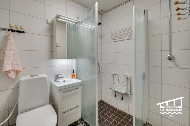 - WC-istuin, suihku, suihkuseinä, pesukoneliitäntä, peilikaappi, pesuallas, ja allaskaappi