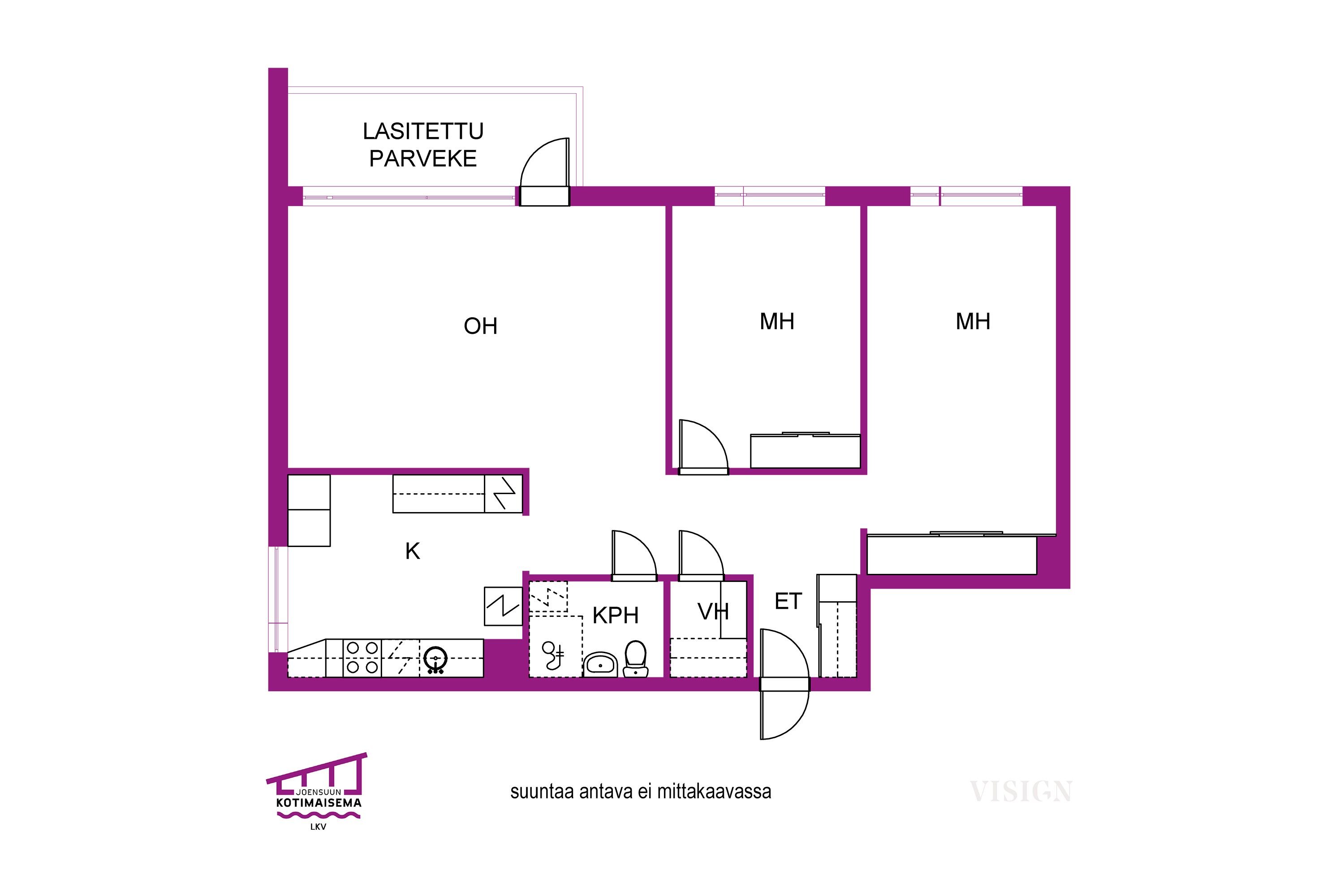 - Olohuone, parveke ja makuuhuoneet kaakkoon. Keittiö koilliseen.