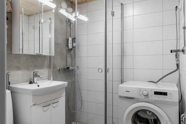 - WC-istuin, suihku, suihkuseinä, pesukoneliitäntä, peilikaappi, bidee-suihku, allaskaappi, ja pesuallas