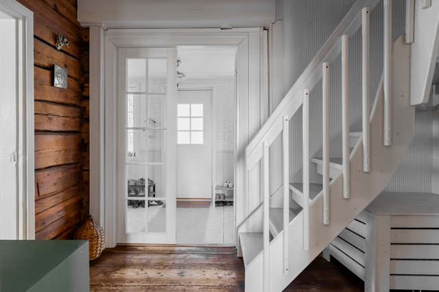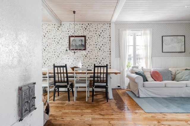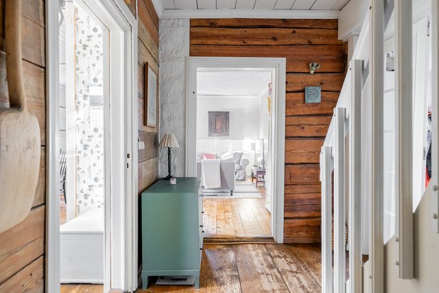 Vanhaa ei kuitenkaan tuhottu: alkuperäiset leveät lattialaudat on kunnostettu ja asennettu takaisin, ja hirsirunkoa on jätetty esille harkitusti. Lopputuloksena talo on täysin päivitetty, mutta tunnelmaltaan aito ja lämmin.