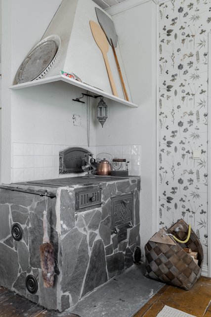 - Takka, varaava takka ja puuhella ruokailutilassa (vanha keittiö)