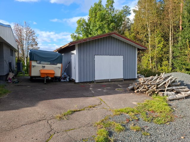 - Pihassa erillinen puurakenteinen lautaverhoiltu autotallirakennus, jossa betoni lattia.