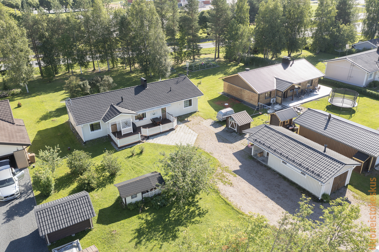Viihtyisä tontti on iso 1618 m2 ja siinä riittää tilaa niin lasten leikeille kuin puutarhallekin. Pihapiirissä on valmiina leikkimökki, puuliiteri ja autotalli-/varastorakennus. Autotalliosa on muutettu lämpimäksi harrastetilaksi ja se on vaivattomasti muutettavissa takaisin autotallikäyttöön. Varastotilaa on runsaasti sekä omakotitalossa että autotallissa. Kiinteistöllä on valmiina Elisan valokuituliittymä.