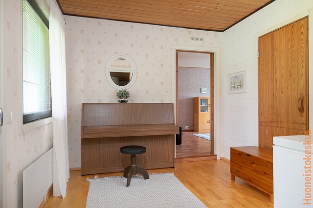 - Takkahuoneessa parkettilattia ja seinät tiili/tapetti. Hormi. Ovi ulos takapihalle.