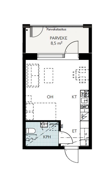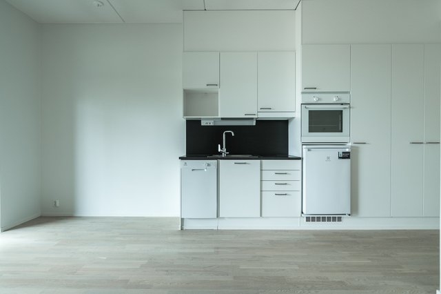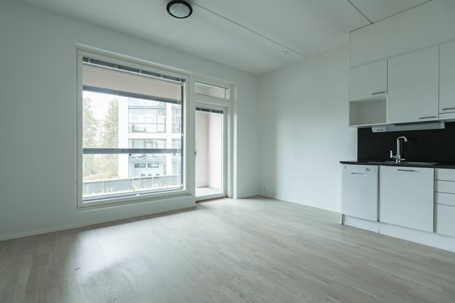 Keittiö on moderni ja hyvin varusteltu: integroidut kodinkoneet, induktioliesi ja runsaasti säilytystilaa tekevät ruoanlaitosta vaivatonta. Olohuone ja makuutila yhdistyvät toimivaksi kokonaisuudeksi, joka sopii niin yhdelle asukkaalle kuin pariskunnalle.